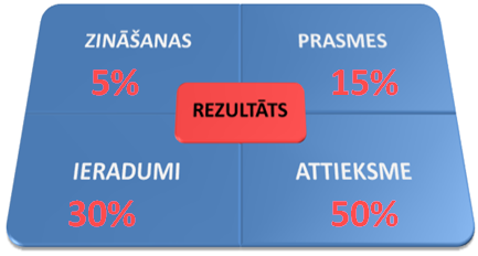 Novērojumi un mana personīgā pieredze liecina, ka zināšanas ir apmēram 5%, prasmes 15%, ieradumi 30% un attieksme 50% no kopējā snieguma.