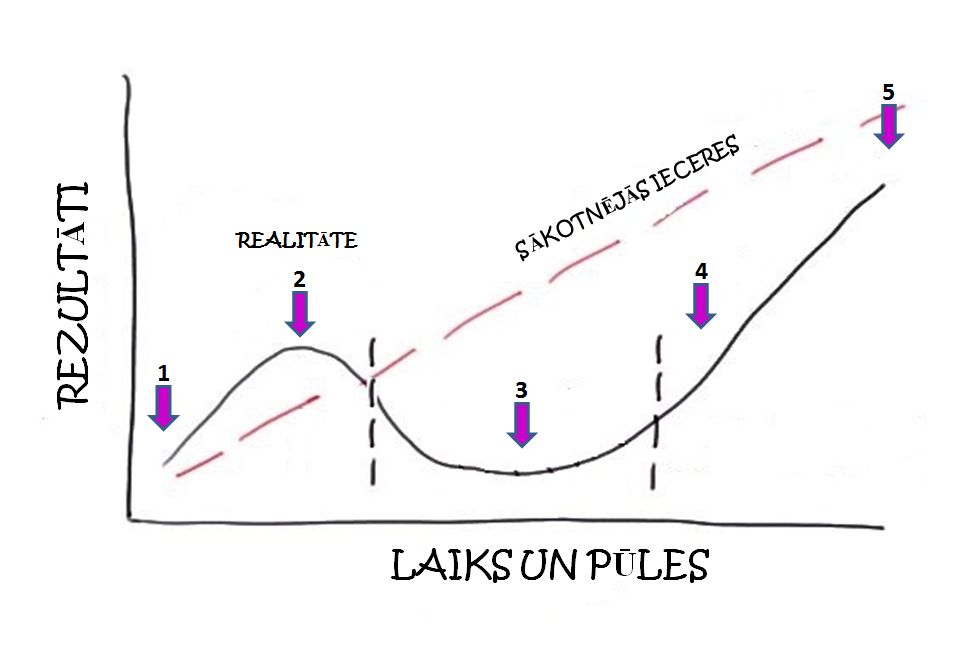2. Tava motivācija un enerģija nes augļus, un tu nokļūsti punktā nr. 2, kur sastopies ar realitāti. Realitāte nozīmē – ierēdņu birokrātiju, konkurentu spērienus, sabiedrības vienaldzību, ģimenes neizpratni, klientu vēlmi visu dabūt par brīvu un tamlīdzīgus pārsteigumus. Nevilšus rodas atklāsme, ka dzīve nav nemaz tik rožaina, kā iepriekš šķita un, ka ar motivācu ir daudz par maz. Tu saproti, ka šī ir tava šī brīža spēju robeža un esošo kompetenču līmenis neļauj sasniegt vairāk.
