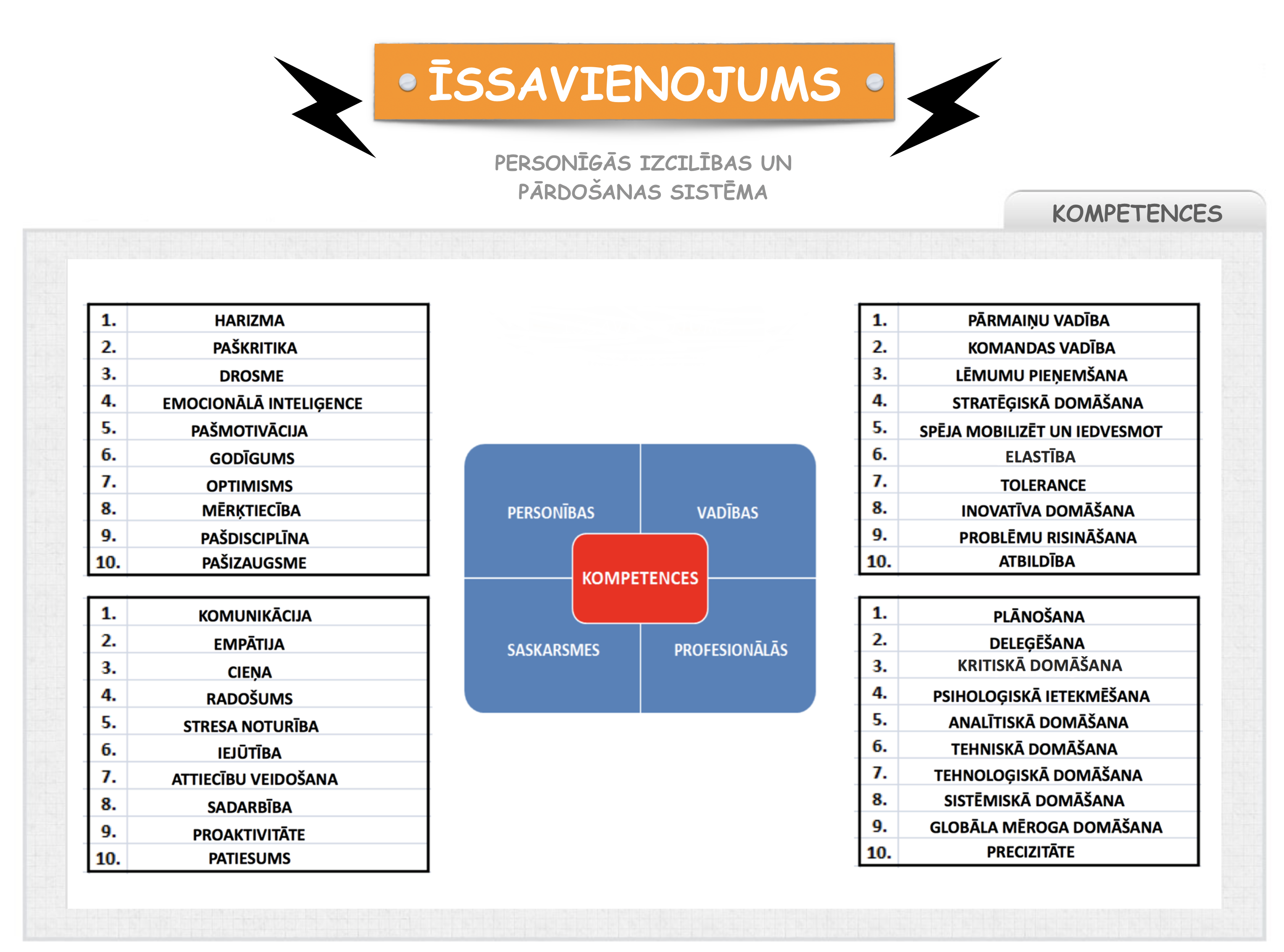 Pievienotajā attēlā ir efektīva uzņēmēja 40 kompetenču pārskats, kas sadalīts 4 segmentos pēc kompetenču piederības. Tālāk, atliek vien sekot jau zināmajam algoritmam.