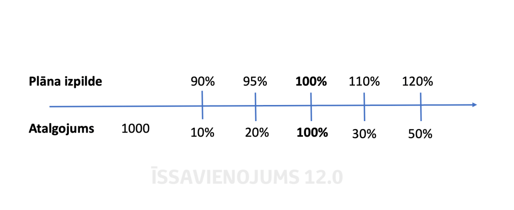 Attēlā ir praktisks piemērs. Pieņemsim, ka pamata alga ir 1000. Plāns jāizpilda par 100%. Protams, vadītājs var maksāt pilnu pamata algu tikai tad, ja plāns ir sasniegts, taču reizēm izpilde nav redzēta kopš 1976 gada vasaras. Tas demotivē, tāpēc es iesaku definēt noteiktus atskaites punktus pirms un pēc plāna.